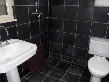 1 large en-suite bathroom with toilet, basin, shaver point and bath with shower hose.